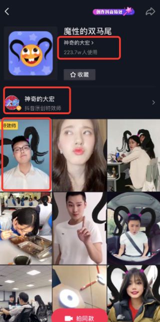在此基础上,最近抖音又增加了特效师本人的露出。比如,上线的#首届抖音道具设计大赛#话题中,全是不同特效师的作品;点开不同的原创道具页,可以看到特效师的账号名称和个人置顶内容等多处曝光。