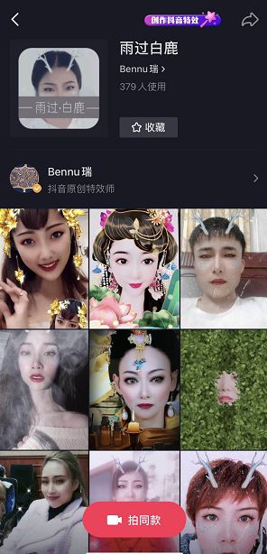 在成功上传了制作的第一款抖音特效后,Bennu瑞发动自己身边的朋友和亲戚都去拍摄,没多久这款道具就上了抖音道具的面板推荐。虽然这款道具还没有严格意义上的“火起来”,但还是激发了她对制作特效的兴趣。