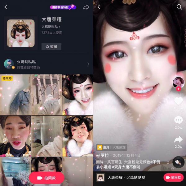 比如,在“不倒翁小姐姐”火遍抖音的时候,特效师“火鸡哒哒哒”做出了一款名为“大唐荣耀”的道具,超过737万人使用。