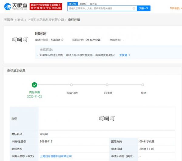 天眼查App显示,近日,上海幻电信息科技有限公司新增多条商标申请信息,商标名称为“呵呵呵”,商标分类为41-教育娱乐,9-科学仪器。商标状态为商标申请中,另外,该公司还申请了“萌派”“阿噗”等商标。