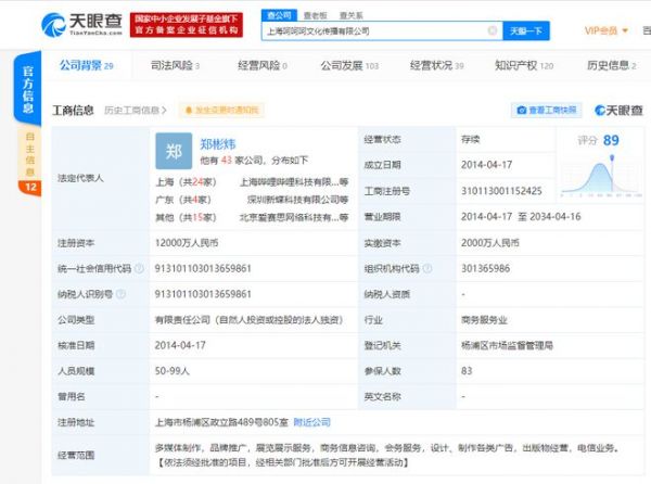 值得一提的是,2014年4月,上海呵呵呵文化传播有限公司成立。该公司法定代表人为郑彬炜,注册资本1.2亿人民币,经营范围含多媒体制作,品牌推广,展览展示服务等。天眼查App显示,该公司由上海幻电信息科技有限公司全资持股。