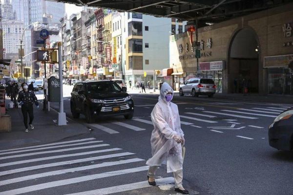 △纽约曼哈顿的唐人街,全副武装的女子在过马路