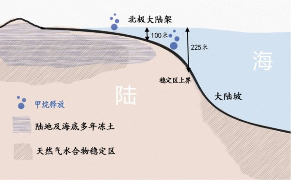 全球约99%的甲烷水合物都形成于大陆坡的海洋沉积物中,剩下的1%则与北半球高纬度地区的多年冻土(permafrost,至少连续两年处于或低于0℃的地面)相关。15000年来,海平面约升高了100米,冻结着甲烷的陆地沉积物被暴露在较先前陆地上更暖的海水中。一般来说,目前在环北冰洋地区,位于陆地几百米厚多年冻土之下,以及深海大陆坡之下的甲烷水合物都会保持稳定,只有浅层大陆架多年冻土和大陆坡上部分中的甲烷水合物容易分解。