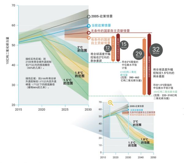 不同情景下全球温室气体排放量及到2030年的排放差距。图片来源:联合国环境规划署《2019年排放差距报告》