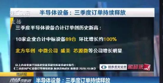 从数据上看,今年5月份的华为新禁令之后,第三季度国产设备中标数量飙升,根据国泰君安对今年第三季度的本土制造厂公开招标结果统计,国内IC 设备厂商在前道设备领域,2020年Q3 合计中标量创历史新高。10家国内设备厂商单季度合计中标设备量为89 台,环比增长约100%,和2019年第三季度相比,同比增长300%。