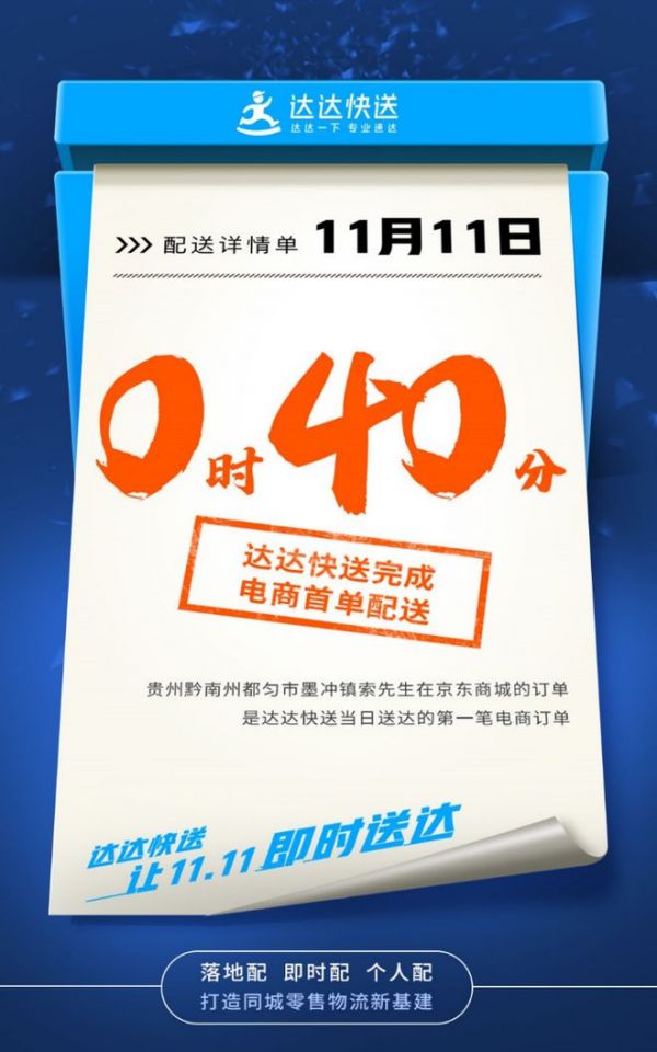 11月11日消息,今日0点40分,贵州省黔南布依族苗族自治州都匀市墨冲镇的达达快送骑士周师傅用时25分钟,完成平台首个京东商城订单配送。