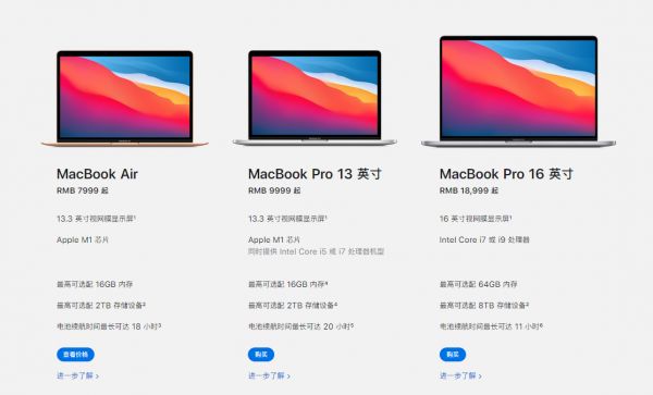 价格方面,M1版MacBook Air国行版本的起售价依旧是7999元,搭载8GB内存和256GB SSD;花9799元则可以买到8核GPU并升级至512GB SSD。搭载M1芯片13英寸MacBook Pro,国行版本起售价9999元,