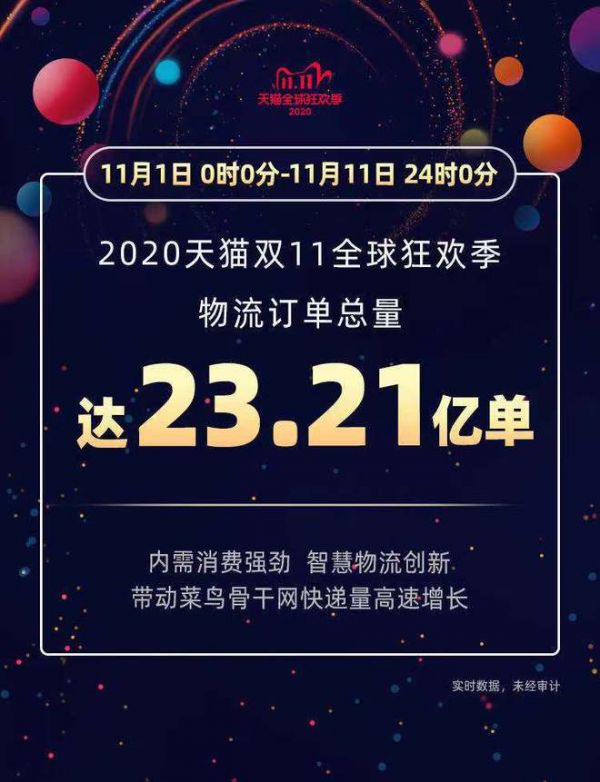菜鸟:天猫双11期间物流订单量达23.21亿