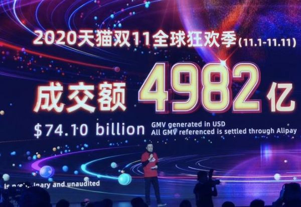 2020年天猫双11,从11月1日到11月11日的总成交额(GMV)达到4982亿元。