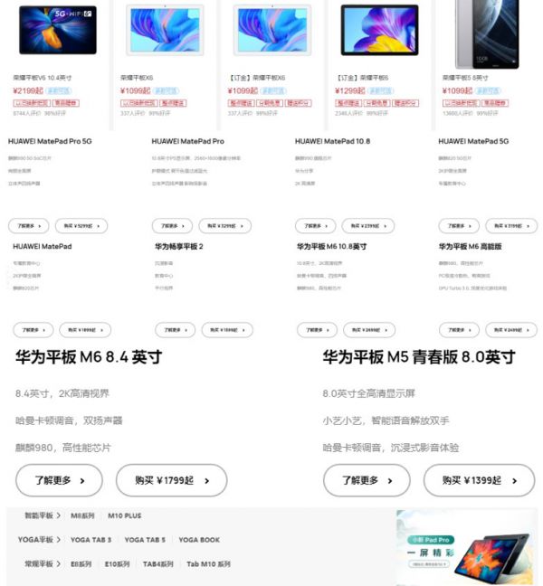 就在米粉们纠结这款到目前为止小米唯一平板新品扶不上墙的时候,对于高端平板有生产力需求的用户可能已经选择了苹果或者三星的新款产品,从2018年到现在,将近两年过去了,在国内市场,小米的“友商”们已经在多个价位玩出了花,粗略看了一下在2019年——2020年间,友商们推出了若干的分支类平板产品多达几十款,价位从1000——6000元都有,刀法精准且似乎玩出了自己的一套生态: