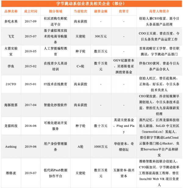 如上表it桔子所统计的14家字节跳动系创业公司,仅有3家未有公开融资记录,获投率高达80%。