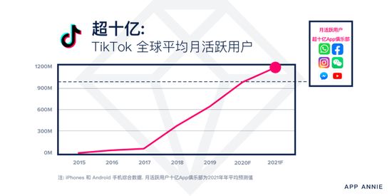 2020年,TikTok 实现大幅度增长,在全球范围内积累了大量活跃用户,与2018年相比,其活跃用户数量达到原来的三倍。我们预计,到2021年,TikTok活跃用户数不会仅限于每月10亿,而是将直接突破12亿。