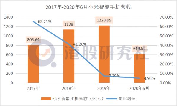聚焦到手机业务,同期小米智能手机的营收分别为805.64亿元、1138亿元、1220.95亿元和619.52亿元,同比增速分别为65.21%、41.26%、7.29%和4.95%。虽说2020年有疫情的因素在内,但2019年这一增速就已经是个位数增长。