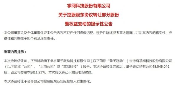 量子跃动持有公司4504.50万股,占公司总股本的11.23%。而量子跃动正是字节跳动的子公司,字节跳动持有其100%的股权。双方一致同意,本次股份转让价格确定为24.42元/股,不低于本协议签署日前一个交易日的上市公司股票收盘价的90%,股份转让价款总额为11亿元。交易完成后,字节跳动将成为掌阅科技的第三大股东。