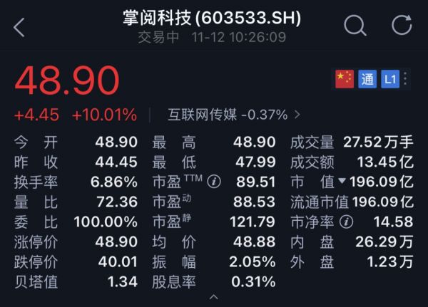 “字节效应”开始显现。截至11月12日,掌阅科技已经实现了6个涨停,市值超196亿,而在11月4日,掌阅科技的市值为110.68亿,几天内的涨动超过85亿。而掌阅科技目前报48.9元/股,已经累计涨77.71%,按此计算字节浮盈11.03亿元。