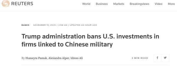 【环球网快讯】路透社消息,特朗普政府12日突然公布一项行政命令,禁止美国投资者对中国军方拥有或控制的企业进行投资。路透社称,这是美国大选日后,特朗普政府加大对华施压的最新动作。
