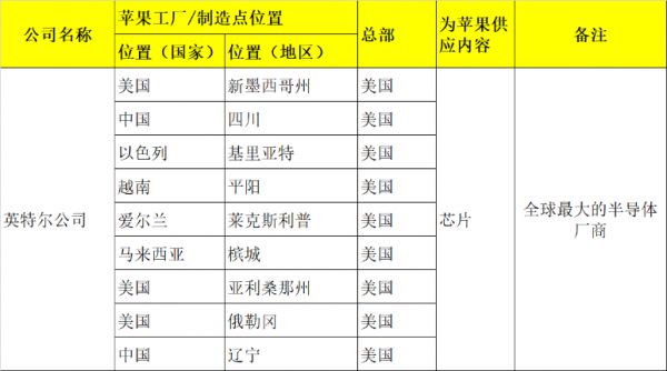 要知道,在这份供应链名单中,如果没有与苹果相关的内部生产基地则会直接以总部形式出现。英特尔上述9家工厂或制造点,直接与苹果有着直接的关系。