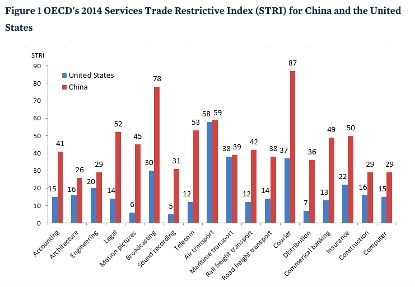 然而,中国服务贸易出口的数据较制造业出口的数据,小巫见大巫。中国服务贸易的门槛仍高冷不可攀,成为经合组织里的“异类”[4]。