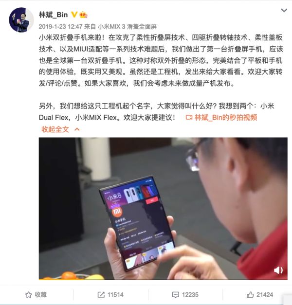 2019年1月,小米联合创始人林斌在微博上晒出把玩小米折叠屏手机工程机的视频,并配文称,“攻克了柔性折叠屏技术、四驱折叠转轴技术……等一系列技术难题后,我们做出了第一台折叠屏手机,应该也是全球第一台双折叠手机。”
