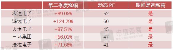 从表中可以看出,五家公司第三季度涨幅巨大(基本上也是第三季度才真正爆发板块行情)。其中,鸿远电子表现最佳,实现124.29%的涨幅领涨板块,即便最弱的三环电子也录得56.01%的收益。同时,这五家公司均在第三季度创出历史新高。虽然涨幅惊人,但按头部券商对五家公司今年的盈利预测,其对应PE还要大幅小于上表数据。