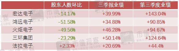 通过上表可以发现,除了法拉电子股东略增长2.33%,其它四家公司环比都在下降。尤其火炬电子和鸿远电子,股东人数更是“腰斩”。从业绩来看,法拉电子也略显“逊色”,其它四家公司业绩出现“暴走”,尤其是第三季度基本都实现翻倍增长。