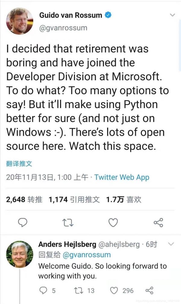 今天,Python 之父 Guido van Rossum 在 Twitter 上正式宣布,退休太无聊,如今加入了微软开发者部门。