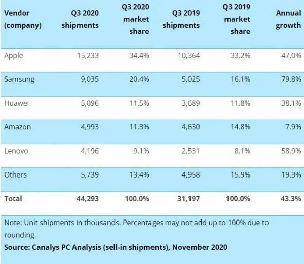 根据调研机构IDC、Canalys的数据,平板市场在2020年出现相当明显的扩大,扭转了过去几年的缩紧。一方面和教育、娱乐等需求在疫情期间的增长存在关系,另一方面也是作为头部厂商的苹果、三星、华为,在产品力层面持续投入的结果。