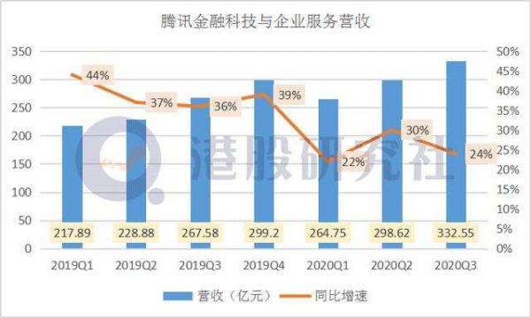 数据显示,腾讯的金融科技与企业服务业务营收332.55亿,同比增长26%,占总营收比重的26%。仅看单季度的增长,这依然是一个不错的增速。但相比去年同期28%的营收占比,出现了下滑。此外,相较于去年同期36%的增速亦有下滑。