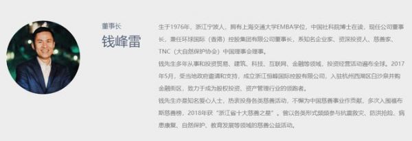 据恒峰国际官网介绍,董事长钱峰雷,生于1976年,浙江宁波人,拥有上海交通大学EMBA学位,中国社科院博士在读,现任公司董事长,兼任环球国际(香港)控股集团有限公司董事长,系知名企业家、资深投资人、慈善家、TNC(大自然保护协会)中国理事会理事。