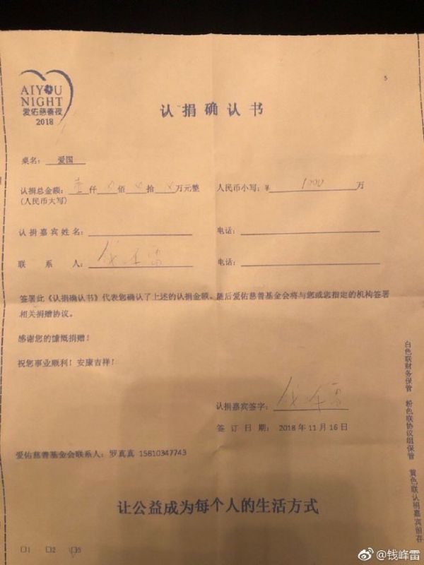 恒峰国际官网显示,2018年10月,首届浙江慈善爱心榜发布,钱峰雷获“浙江省十大慈善之星”。