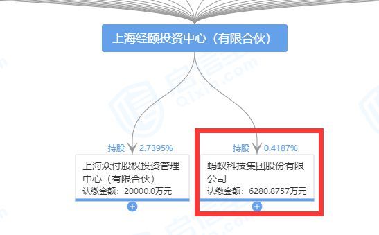 蚂蚁集团上海系的另一股东——上海经颐投资中心(有限合伙),据启信宝数据,截止2019年10月12日,钱峰雷先生持有上海经颐投资中心(有限合伙)4.8845%的股份。