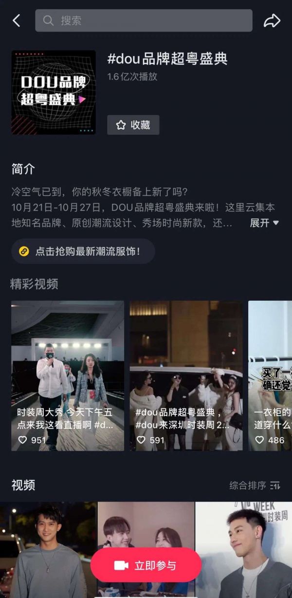 作为国内头部短视频平台,抖音发挥自身优势与深圳时装周合作打造了“DOU品牌超粤盛典”,大量原本在抖音上活跃的头部达人、品牌方和原创设计师开始活跃在这个舞台,并将线下服装周的影响力借由线上平台持续放大。