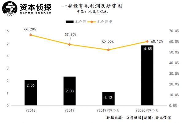 毛利润方面,一起教育2018年、2019年、2020年前9个月毛利润分别为2.06亿、2.33亿、4.85亿元人民币。