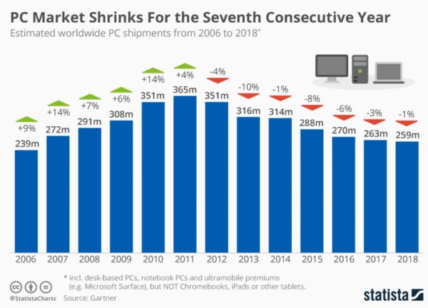 最核心的原因指向了连年萎缩的PC市场,Gartner数据显示,自2011年到达顶峰之后,全球PC市场的销量便开始了连续7年下滑,2016年后的市场,更是连续创下了2006年之后的最低水平。
