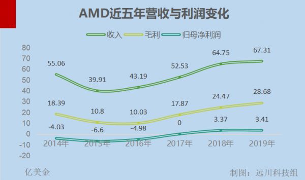 而反观AMD,尽管在CPU市场,AMD的市占率从2016年的不足10%一路增长至如今的37.5%,创下14年来的最高纪录,但是翻倍的市占率显然没能带来翻倍的营收与利润:2016年至2019年,AMD的营收仅仅从从43亿美金提升到了67亿美金。