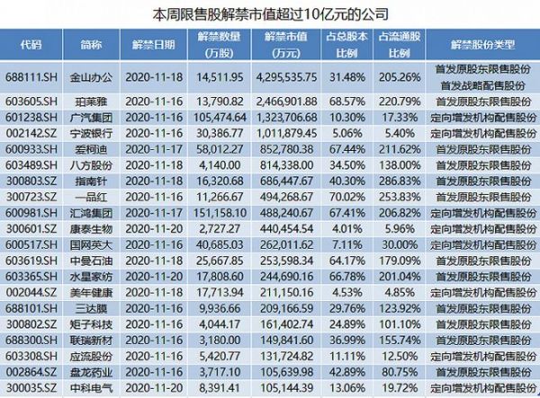 本周有4家公司解禁规模超百亿市值,分别为金山办公(688111.SH)、珀莱雅(603605.SH)、广汽集团(601238.SH)、宁波银行(002142.SZ)。