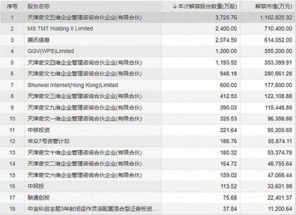 金山办公此次解禁包括首次公开发行部分限售股及战略配售限售股,涉及股东分别为6名和12名。其中天津奇文五维企业管理咨询合伙企业(有限合伙)持股数量最高,3725.76万股,占此次解禁比例的四分之一,市值约110亿元。此外,还包括MS TMT HoldingⅡLimited、腾讯信息、纪源资本、中移投资、中网投、联通创投等。