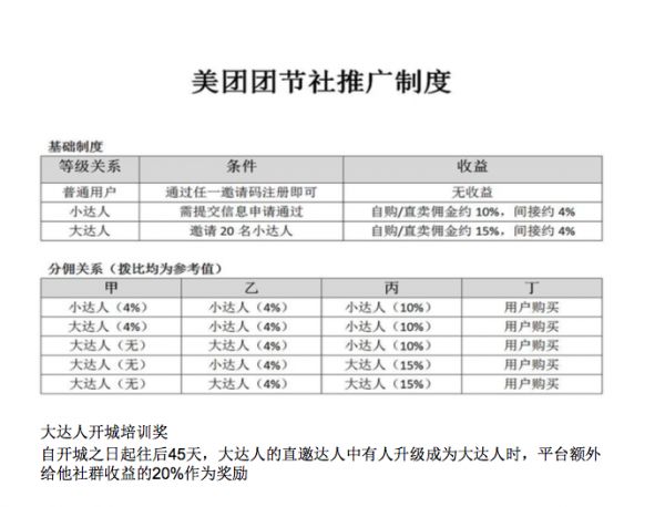 事实上,10月31日,美团团节社就发放了全国首码。美团设计了一个分销体系,具体为通过首码注册,且邀请20名小达人为大达人,且用户购买后,不同的达人拥有不同的分佣比例。
