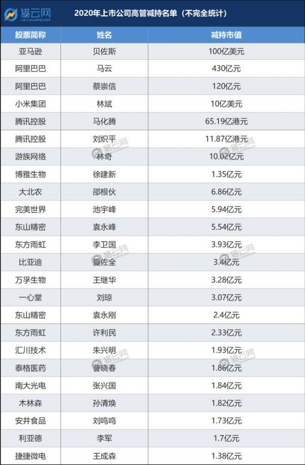 猎云网根据公开资料,整理了今年以来上市公司高管减持名单,其中不乏阿里巴巴、腾讯、小米等互联网巨头企业高管。