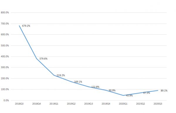 从GMV上看,拼多多三季度的年度GMV为14576亿元,同比增长73.5%,低于去年同期143.7%的增速;营业收入142.1亿元,同比增长89.11%,和去年122.84%相比差距显著;ARPU(每个用户的收入)上看,同比增长27.2%,去年同期数据为75.2%。
