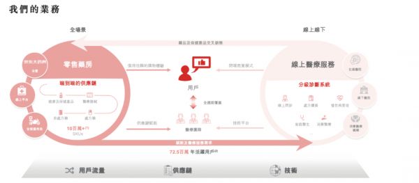 一方面,零售药房业务将用户群导向医疗健康服务,以进行在线问诊和处方续签;另一方面,通过提供慢性病管理和家庭医生服务等服务,在线医疗健康服务在理论上能够预判用户需求、改善用户体验以及将用户流量重新导向零售药房业务,购买其他健康产品,如补品和医疗设备。