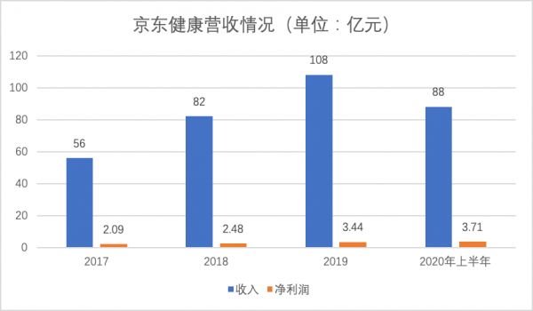财务数据方面,2017年至2019年,京东健康的营业收入分别为56亿元、82亿元和108亿元;2020年上半年,京东健康的营收为88亿元,较2019年同期的50亿元增长76%。