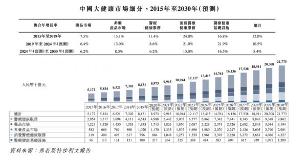 根据弗若斯特沙利文报告,2019年中国大健康行业的市场规模达到人民币81,310亿元,预计2030年将增至人民币217,730亿元,复合年增长率为9.4%。下图是2015年至2030年中国大健康市场的历史及预测市场规模。