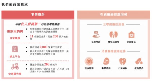 根据弗若斯特沙利文报告,于2019年收入计,京东健康是中国最大的在线医疗健康平台,也是中国最大的在线零售药房,市场份额为29.8%。可见零售药房业务和在线医疗是京东健康的核心业务。