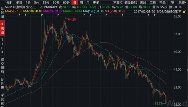 这一次并没有上一次那么好的运气,天齐锂业收购SQM后不久锂价格开始出现持续性下跌,SQM的股价也出现持续性下跌,股价从2018年5月的50多美元跌至2019年底20多美元,这就导致上面所讲的2019年天齐锂业对SQM的长期股权投资计提资产减值约52.79亿元,同时因并购贷款2019年产生利息费用总共约16.5亿人民币。