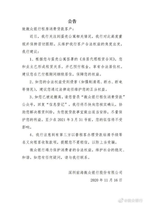 针对近日蛋壳公寓爆出经营困局,今天下午与其合作 “租金贷”业务的微众银行在其官方微博发布公告称,根据租户与蛋壳公寓签署的《房屋代理租赁合同》,租户和业主已形成租赁关系,并已预付租金,享有合法居住权。建议租户在已付租期间继续居住,保障您的权益。
