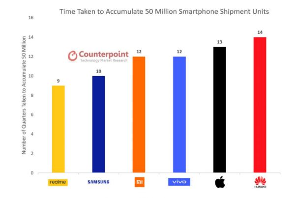 Counterpoint数据报告:realme为全球最快达到5000万销量的手机品牌