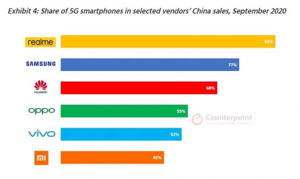 Counterpoint数据报告:2020年9月,中国5G智能手机销售份额