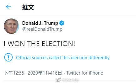 @北京日报【刚刚,特朗普又发一遍:我赢了大选】美东时间16日凌晨0时,特朗普也曾发推称“我赢了大选”。不过随后,他的这条推文被推特官方贴上标签“与官方消息源对这场选举判定的结果不同”。