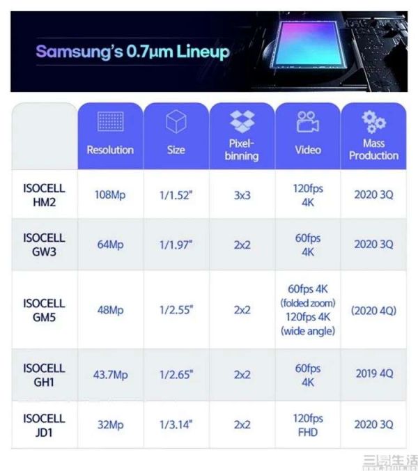 2020年9月中旬,三星半导体突然一口气推出了多款新的CMOS产品,它们包括1.08亿像素的S5KHM2、6400万像素的S5KGW3、4800万像素的S5KGM5,以及3200万像素的S5KJD1。这四款新CMOS有两个很引人注目的共同特点,一是它们均使用了新的0.7μm超小像素设计,使得传感器本身的尺寸相比上一代型号大幅缩小,可以适配更薄的镜头;而另一点,就是官方在推出这些新款CMOS的时候,直接指明它们不仅可以用作主摄,同时也各自针对不同的副摄用途进行了优化,比如说新的1.08亿像素和6400万像素方案都可以用于前摄,而新的4800万像素方案则专门针对超广角/超长焦镜头的使用做了优化。